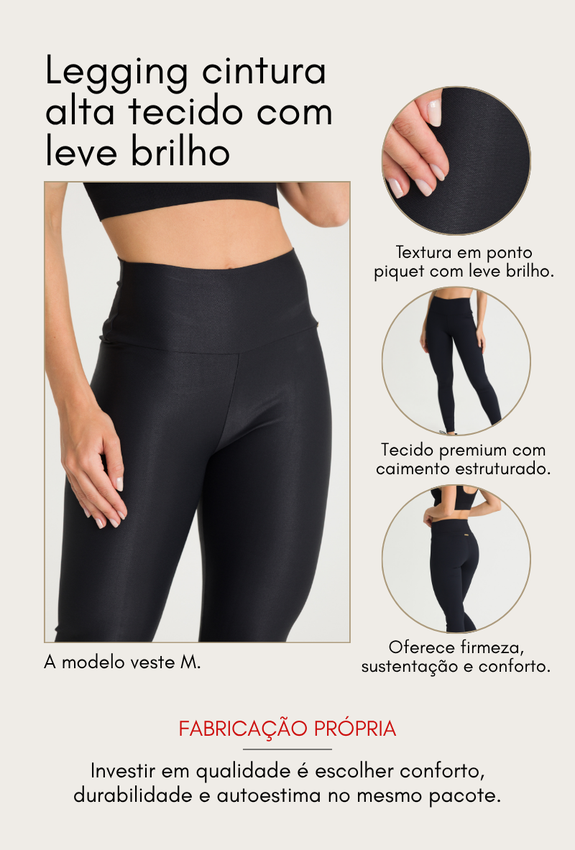 Desenvolvida com o tecido Beats, este modelo de legging possui textura em ponto piquet com leve brilho. Apresenta caimento estruturado, que oferece firmeza, sustentação e conforto incomparáveis. Indicada para o segmento fitness e para quem busca impacto visual aliado à funcionalidade, ela une tecnologia e estilo em cada detalhe. O cós alto proporciona leve compressão na região do abdômen, modelando e valorizando as curvas com segurança e conforto, graças ao seu tecido premium composto em poliamida.